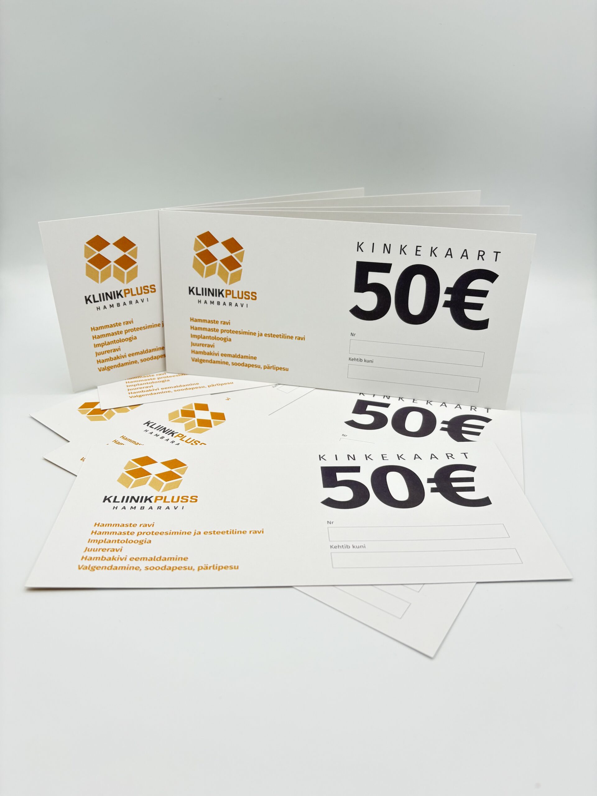 KliinikPluss teenuste kinkekaart annab õiguse saada kehtiva hinnakirja alusel kaardil märgitud summa eest hambaravikliinikus KliinikPluss teenuseid.